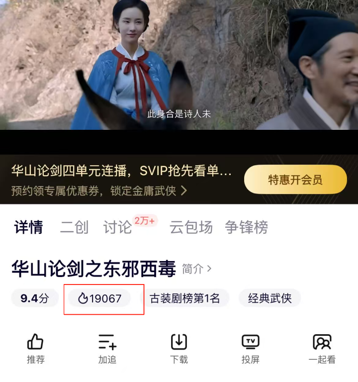 鹅厂的武侠大剧《华山论剑之东邪西毒》,改编自金庸经典《射雕英雄传》,仅播一晚,热度破19000,观众一片好评!